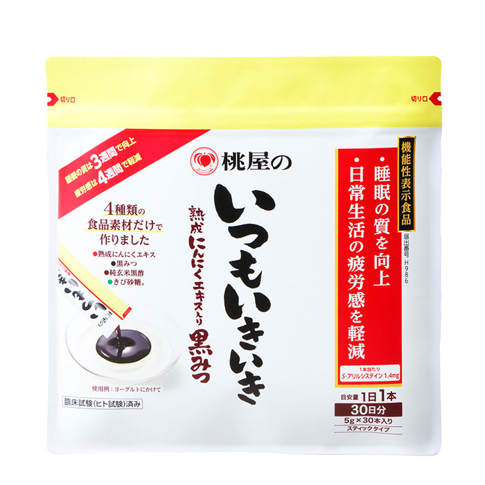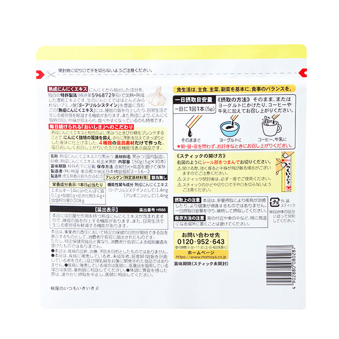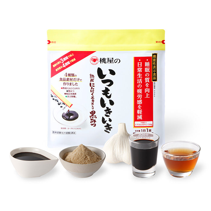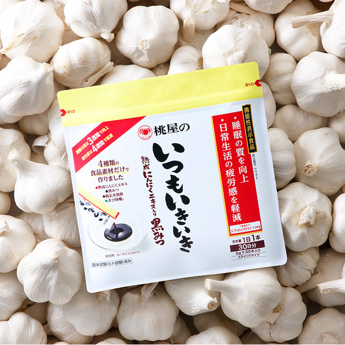 S-アリルシステインなど、にんにく由来の様々な成分を豊富に含む機能性関与成分「熟成にんにくエキス」は、睡眠の質を向上する機能、および、日常生活で生じる疲労感を軽減する機能があります。にんにく関連の機能性表示食品で、睡眠の質の向上効果、抗疲労効果を有する商品は日本初!素材にもこだわり、熟成にんにくエキス、黒みつ、純玄米黒酢、きび砂糖®の4つの食品素材だけで作りました。熟成効果によりにおいもマイルド。一回分が小分けになった液状タイプですので、そのままはもちろんコーヒーやヨーグルト、牛乳などに混ぜても美味しくお召し上がりいただけます。