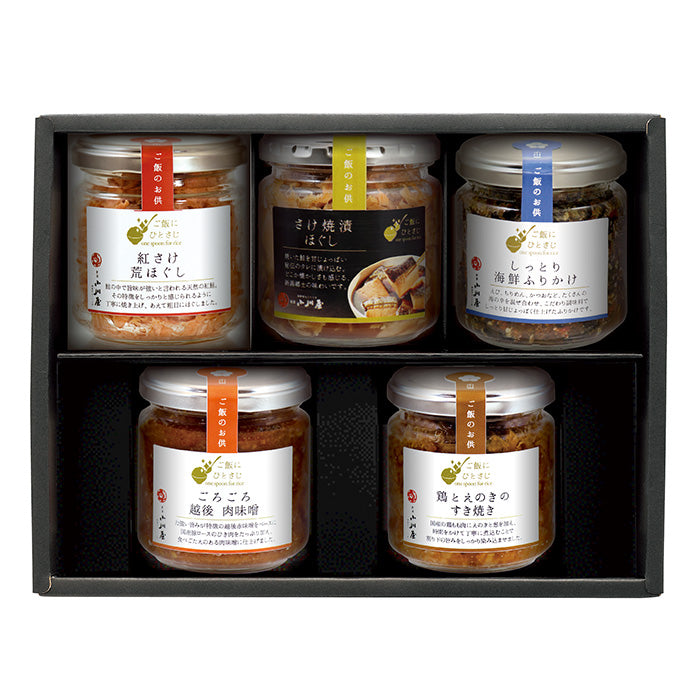 小川屋 ご飯にひとさじ 詰合せ SHC5 新潟 焼鮭 惣菜 和食 紅鮭 豚 鳥 肉味噌 鮭 海鮮 魚 化粧箱付き ギフト のし・ギフト対応不可