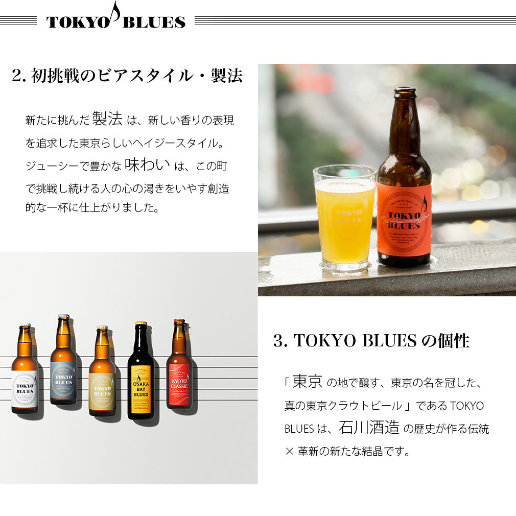 ■ TOKYO BLUES SESSION ALE (セッションエール)2本 上面発酵(エール)タイプで、広がる豊かな柑橘系の香りと、余韻に残るシャープな苦味が印象的。 低アルコール「飲みやすさ」ではなく、“飽きずに飲み続けられる”、“何杯飲んでも飽きない”、 ドリンカビリティ(Drinkability)の高いビールです。 製造者:石川酒造株式会社(東京都) 容量:330ml瓶 アルコール分:4.5%